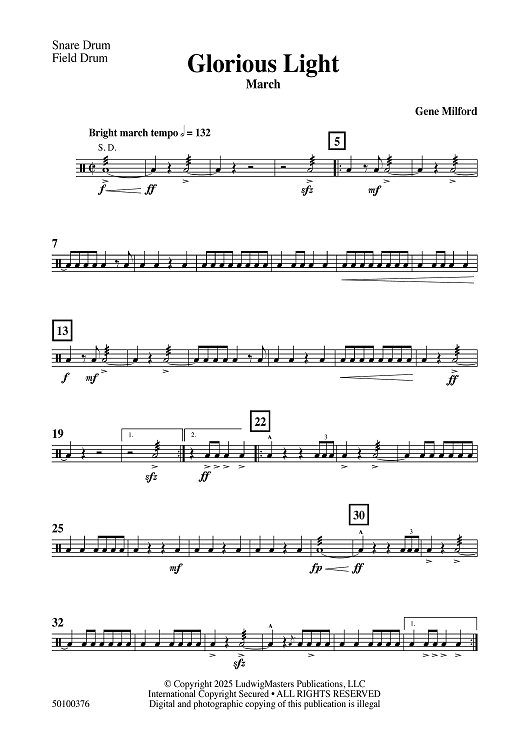 "Glorious Light March - Snare Drum / Field Drum" Sheet Music by Gene Milford