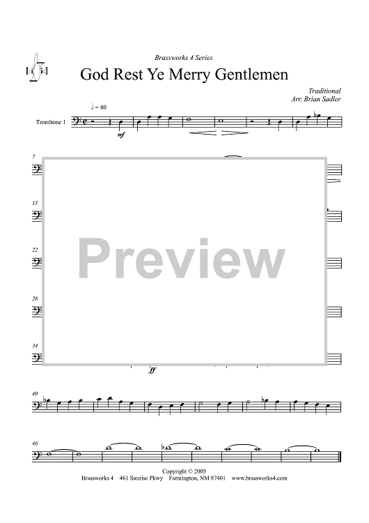Digital Sheet Music for God Rest Ye Merry Gentlemen - Trombone 1 by Traditional, Brian Sadler scored for Brass Ensemble; id:428493