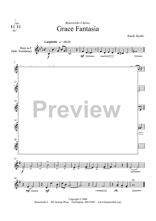 Digital Sheet Music for Grace Fantasia - Horn in F (opt. Trombone) by Randy Snyder scored for Brass Quartet; id:358195