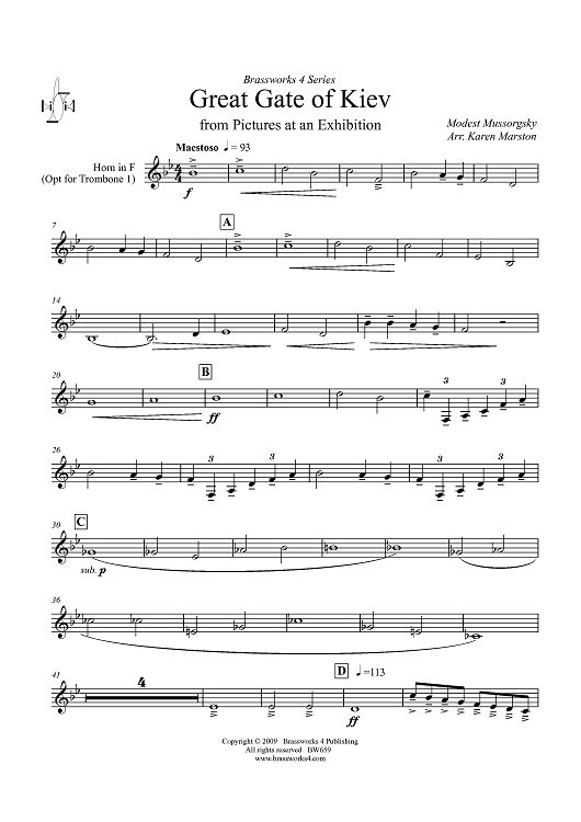 Digital Sheet Music for Great Gate of Kiev - Horn in F by Karen Marston, Modest Mussorgsky scored for Brass Quartet; id:411319