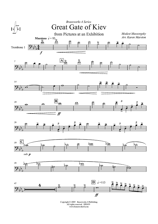 Digital Sheet Music for Great Gate of Kiev - Trombone 1 by Karen Marston, Modest Mussorgsky scored for Brass Quartet; id:411320