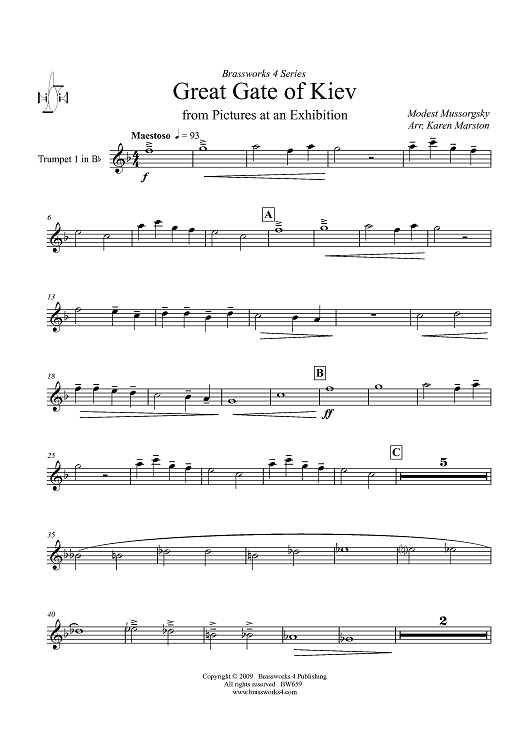 Digital Sheet Music for Great Gate of Kiev - Trumpet 1 in B-flat by Karen Marston, Modest Mussorgsky scored for Brass Quartet; id:411317