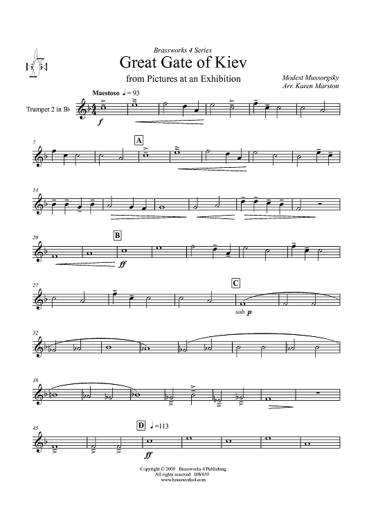 Digital Sheet Music for Great Gate of Kiev - Trumpet 2 in B-flat by Karen Marston, Modest Mussorgsky scored for Brass Quartet; id:411318