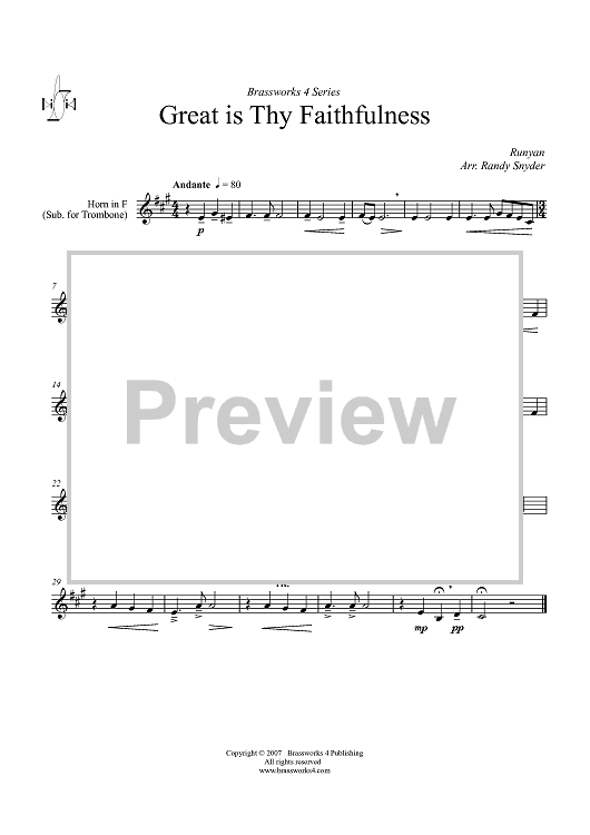 Digital Sheet Music for Great is Thy Faithfulness - Horn in F (opt. Trombone) by William M. Runyan, Randy Snyder scored for Brass Quartet; id:361055