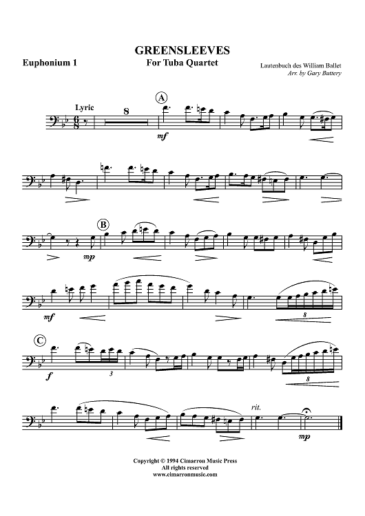 Digital Sheet Music for Greensleeves - Euphonium 1 BC/TC by Gary Buttery, William Ballet scored for Tuba Quartet; id:319068