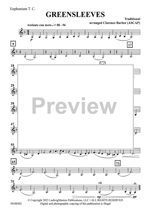 Digital Sheet Music for Greensleeves - Euphonium TC by Traditional, Clarence Barber scored for Concert Band; id:509158