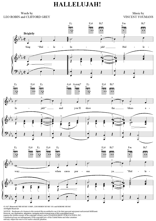 Digital Sheet Music for Hallelujah! by Vincent Youmans, Leo Robin, Clifford Grey scored for Piano/Vocal/Chords; id:307327