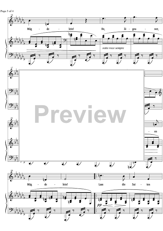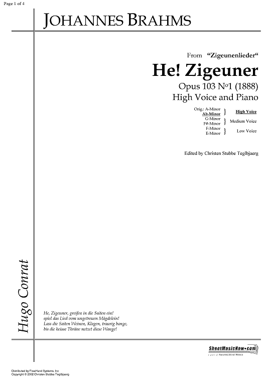 Digital Sheet Music for He! Zigeuner Op.103 No. 1 by , Johannes Brahms scored for Soprano or Tenor/Piano; id:334031