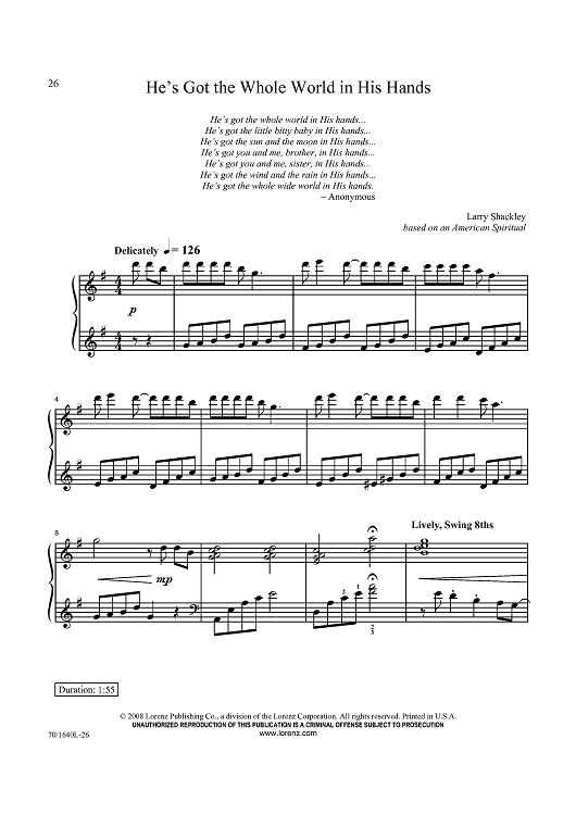 Digital Sheet Music for He's Got The Whole World in His Hands by American Spiritual Song, Larry Shackley scored for Piano Solo; id:433610