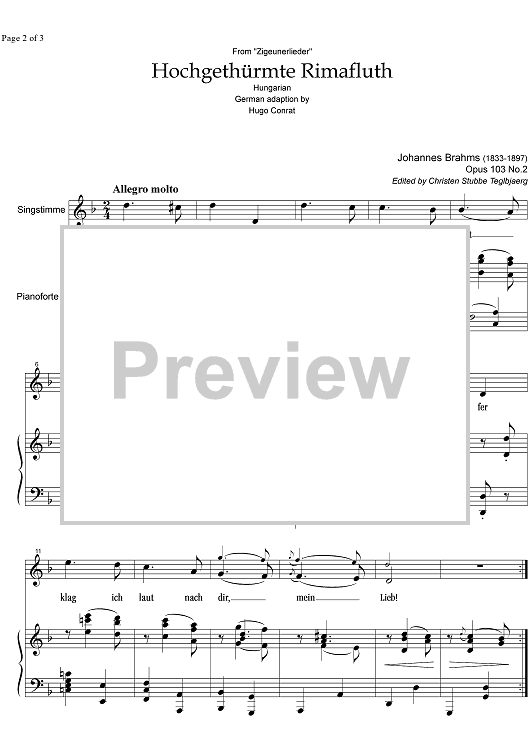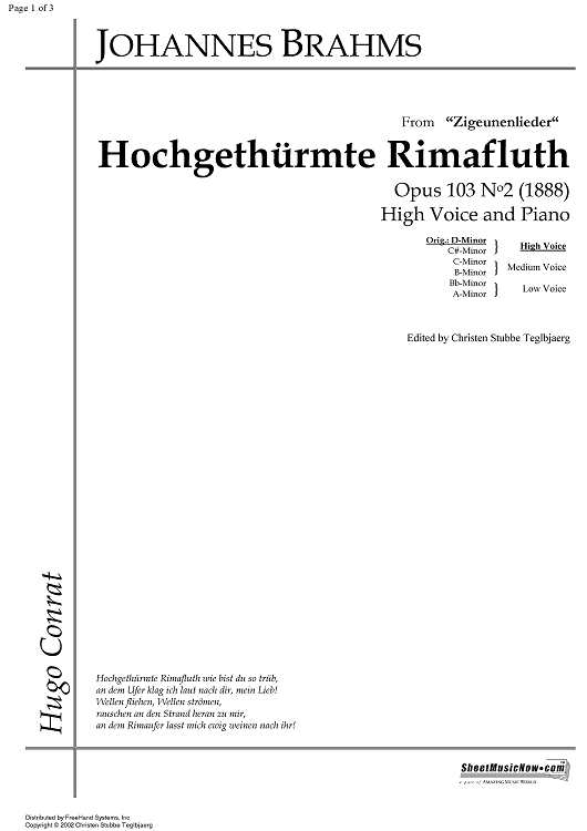 Digital Sheet Music for Hochgethürmte Rimafluth Op.103 No. 2 by , Johannes Brahms scored for Soprano or Tenor/Piano; id:334117