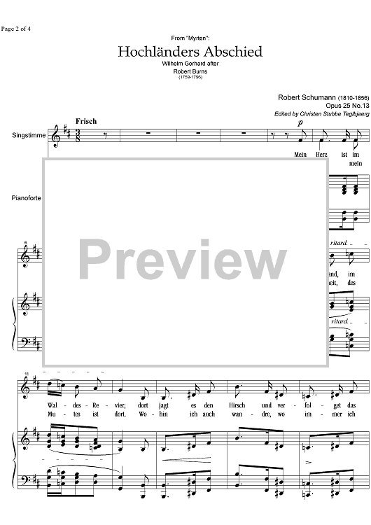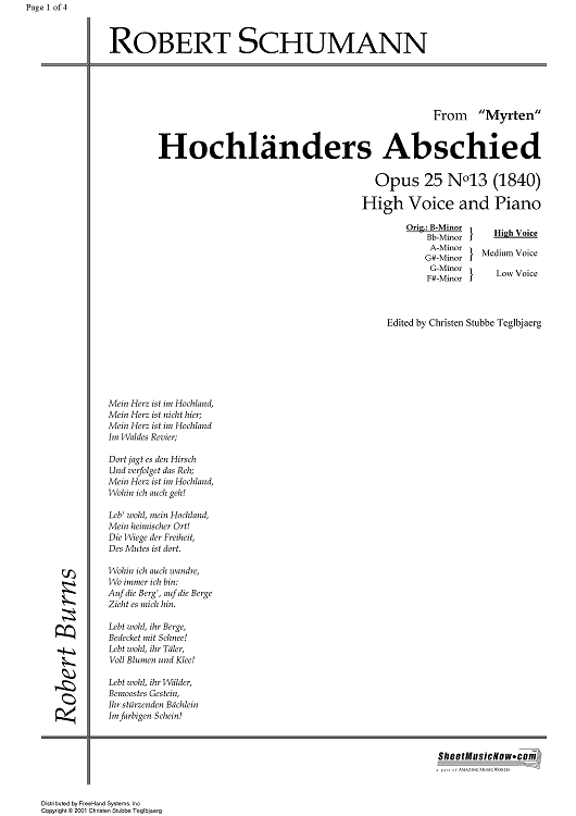 Digital Sheet Music for Hochländers Abschied Op.25 No.13 by , Robert Schumann scored for Soprano or Tenor/Piano; id:332491