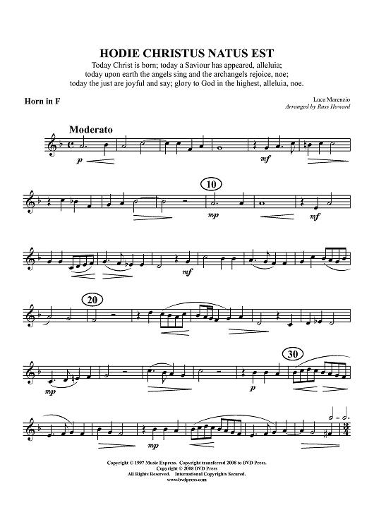 "Hodie Christus Natus Est - Horn in F (plus optional part for Trombone)" Sheet Music by Luca Marenzio