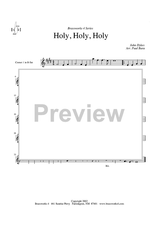 Digital Sheet Music for Holy, Holy, Holy - Cornet 1 in B-flat by Paul Bara, John Bacchus Dykes scored for Brass Quartet; id:317122