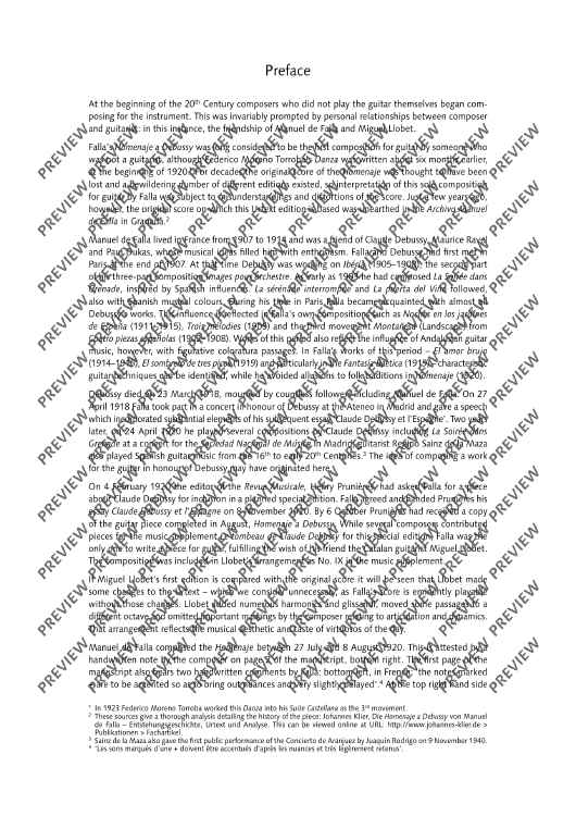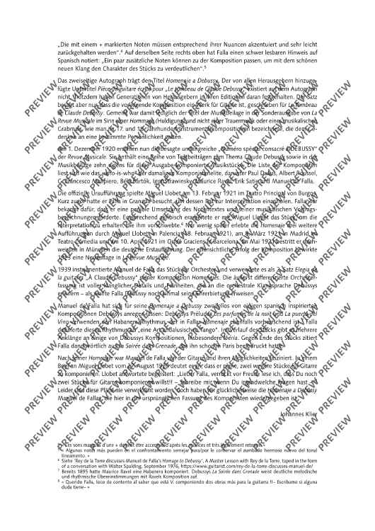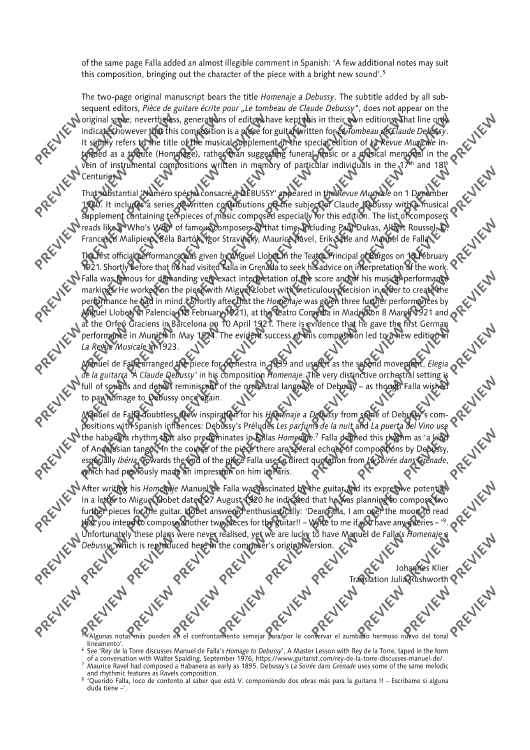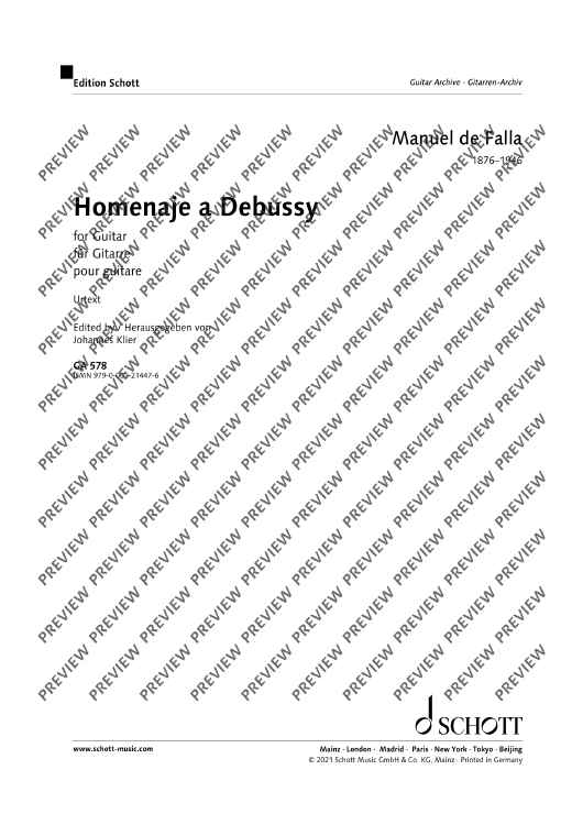 Not only is Manuel de Falla's Homenaje a Debussy is a beautiful tribute to his late friend Claude Debussy, it also is his only guitar work, composed for his friend Miguel Llobet. This new urtext edition is based on the newly rediscovered autograph edition. Editor Johannes Klier offers a detailed preface on the history of its genesis.
