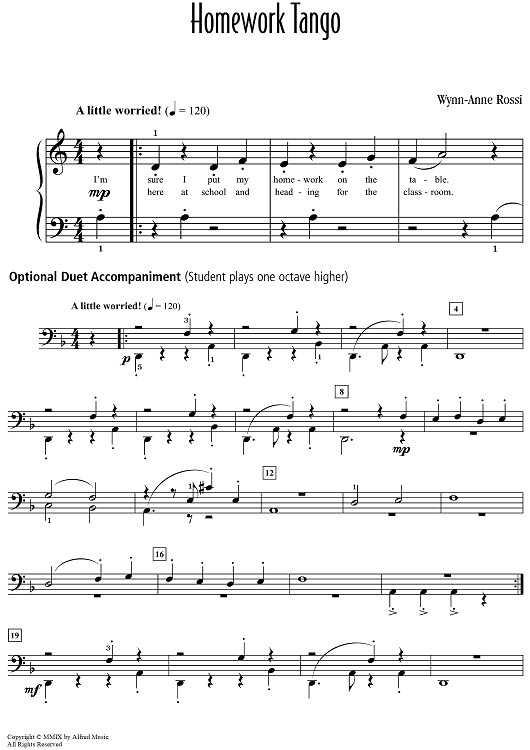 Any child who has ever left his or her homework at home will relate to the lyrics of this charming piece. The melody of this 4/4 meter piece is divided between the left and right hands in the A section. The key of D minor is created with a hand position using left-hand thumb on Middle C and right-hand thumb on Middle D. In the B section, the left hand moves to D position, and the right hand takes over the melody. An optional duet accompaniment provides the rhythm of the tango.