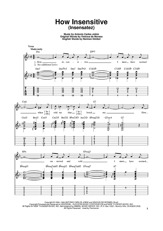 Digital Sheet Music for How Insensitive (Insensatez) by Norman Gimbel, Antonio Carlos Jobim, Vinicius de Moraes, Astrud Gilberto scored for Easy Guitar Tab; id:375085