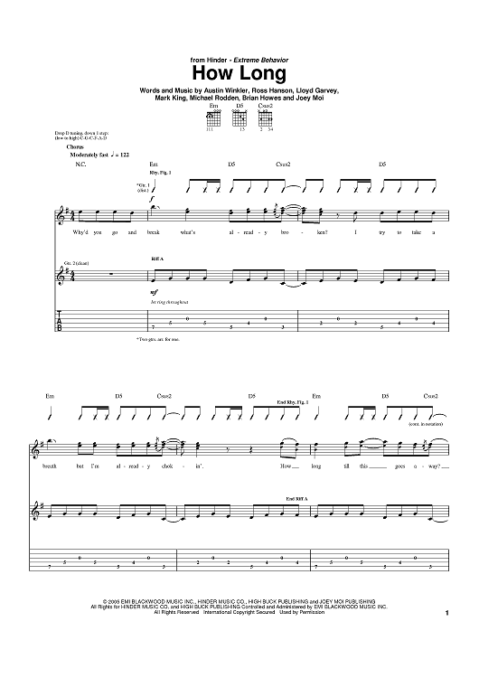 Digital Sheet Music for How Long by Brian Howes, Lloyd Garvey, Ross Hanson, Hinder, Mark King, Joey Moi, Michael Rodden, Austin Winkler scored for Guitar Tab; id:394213
