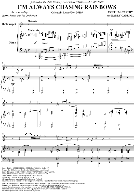 Digital Sheet Music for I'm Always Chasing Rainbows - Piano Score by Harry Carroll, Joseph McCarthy, Harry James and His Orchestra scored for Trumpet/Piano; id:355839