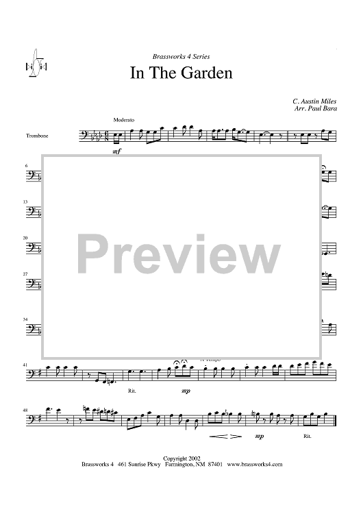 Digital Sheet Music for In the Garden - Trombone by C. Austin Miles, Paul Bara scored for Brass Quartet; id:317167