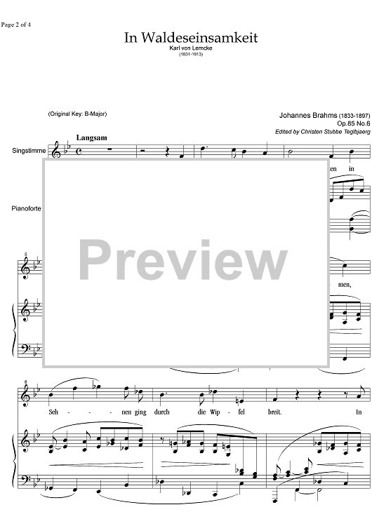Digital Sheet Music for In Waldeseinsamkeit Op.85 No. 6 by , Johannes Brahms scored for Soprano or Tenor/Piano; id:336971