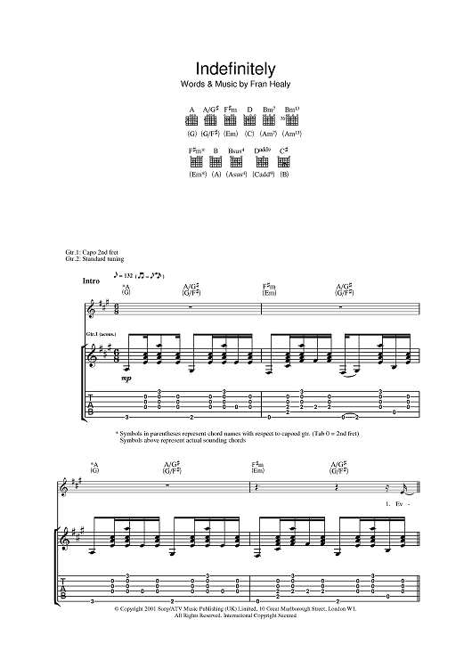 Digital Sheet Music for Indefinitely by Fran Healy, Travis scored for Guitar Tab; id:384189