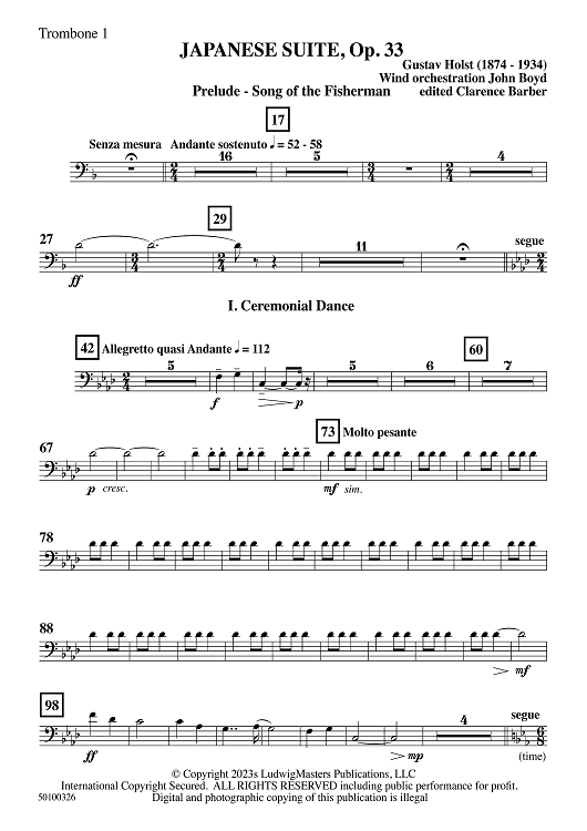 Digital Sheet Music for Japanese Suite, Op. 33 - Trombone 1 by John Boyd, Gustav Holst scored for Symphonic Band; id:509963