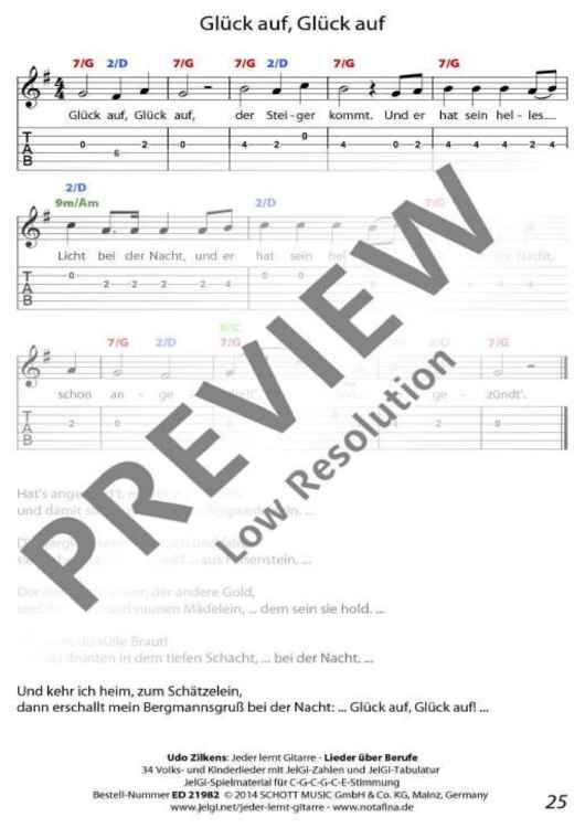 Die im In- und Ausland als Marke registrierte Methode "JelGi - Jeder lernt Gitarre" bietet alle Noten wahlweise für traditionelle Stimmung E-A-D-G-H-E oder für vereinfachte JelGi-Stimmung C-G-C-G-C-E an. Die farbigen JelGi-Zahlen entsprechen den Bünden bei der vereinfachten JelGi-Stimmung, die farbigen Akkordbuchstaben geben die traditionellen Gitarrengriffe an. Weitere Informationen zur JelGi-Methode sind unter www.jelgi.com zu finden.