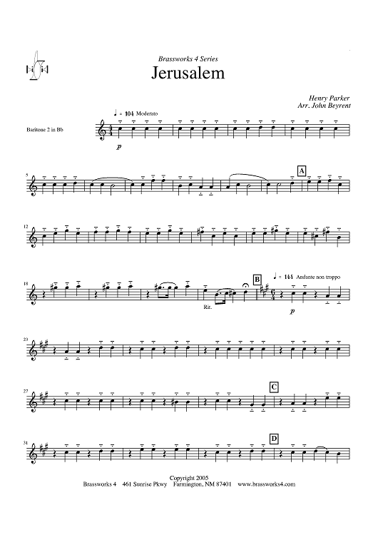 Digital Sheet Music for Jerusalem - Baritone 2 in Bb by Henry Parker, John Beyrent scored for Brass Ensemble; id:428395
