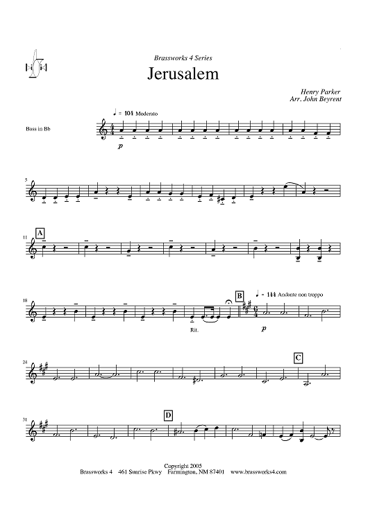 Digital Sheet Music for Jerusalem - Bass in Bb by Henry Parker, John Beyrent scored for Brass Ensemble; id:428401