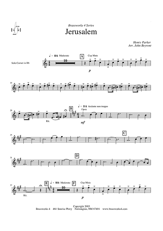 Digital Sheet Music for Jerusalem - Solo Cornet in Bb by Henry Parker, John Beyrent scored for Brass Ensemble; id:428386