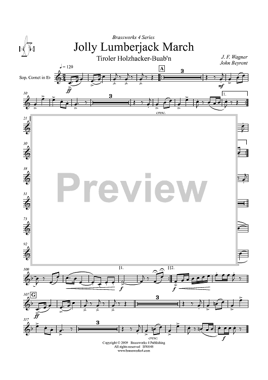 Digital Sheet Music for Jolly Lumberjack March - Cornet in E-flat by J. F. Wagner, John Beyrent scored for Brass Ensemble; id:411259