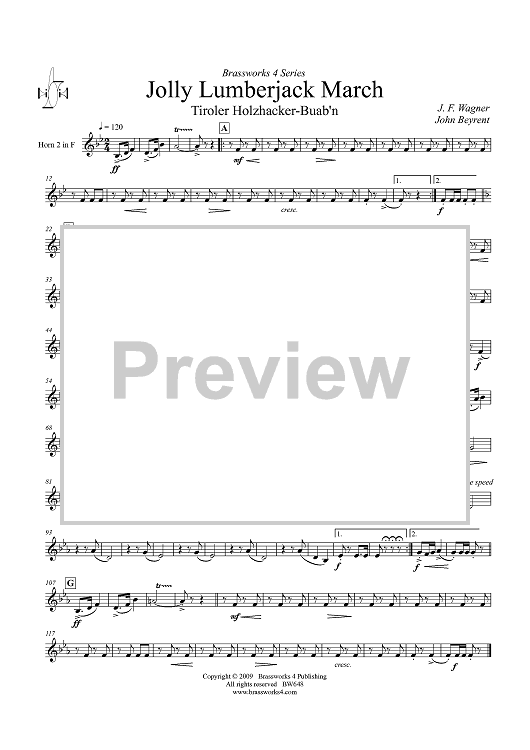 Digital Sheet Music for Jolly Lumberjack March - Horn 2 in F by J. F. Wagner, John Beyrent scored for Brass Ensemble; id:411265
