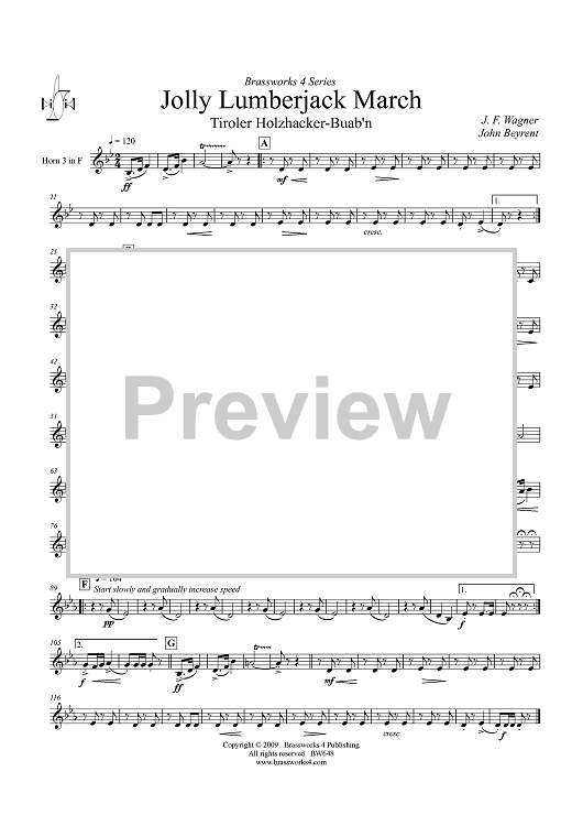 Digital Sheet Music for Jolly Lumberjack March - Horn 3 in F by J. F. Wagner, John Beyrent scored for Brass Ensemble; id:411266