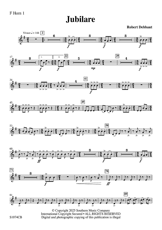 Digital Sheet Music for Jubilare - F Horn 1 by Robert Debbaut scored for Concert Band; id:508247