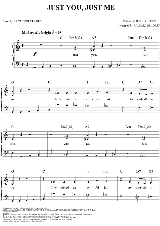 Digital Sheet Music for Just You, Just Me by Nat King Cole, Richard Bradley, Ray Klages, Jesse Greer scored for Easy Piano/Vocal; id:268036