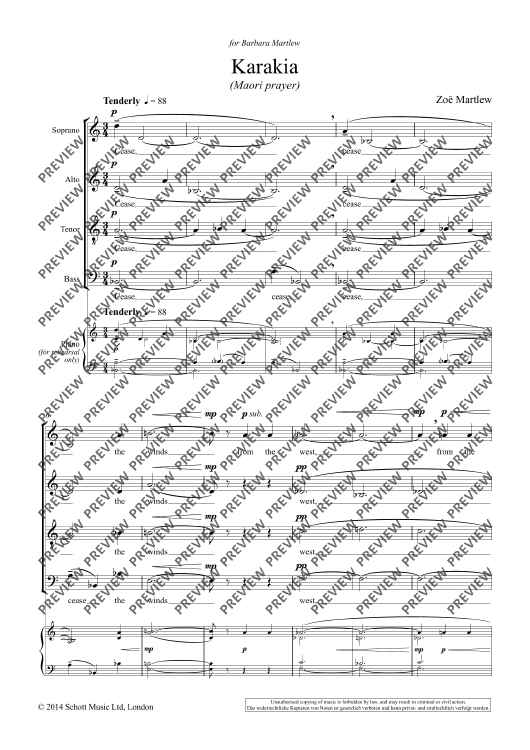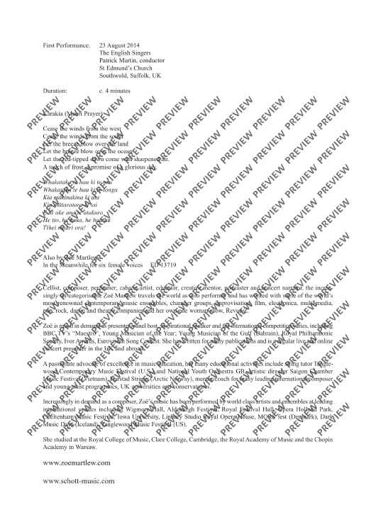 The text of Karakia is a traditional Maori prayer, a homage to the elements and rhythms of nature. Every pitch in the piece is derived from the name of the composer's mother, who was born in New Zealand and died early in 2015. It is a sacred song of remembrance and renewal. © Zoe Martlew