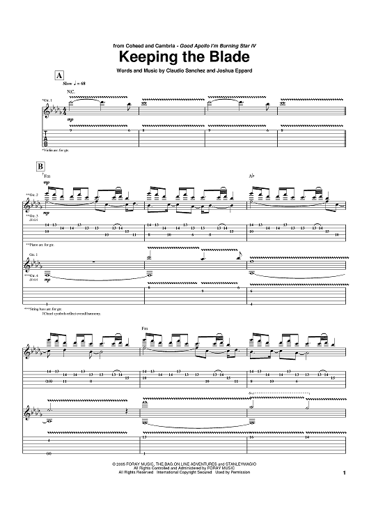 Digital Sheet Music for Keeping The Blade by Coheed and Cambria, Josh Eppard, Claudio Sanchez scored for Guitar Tab; id:391200