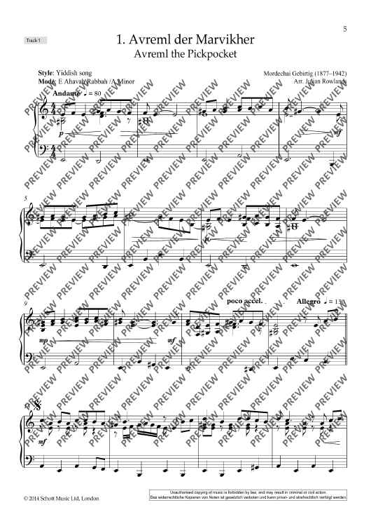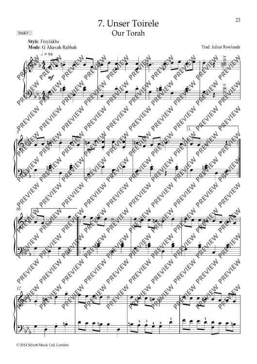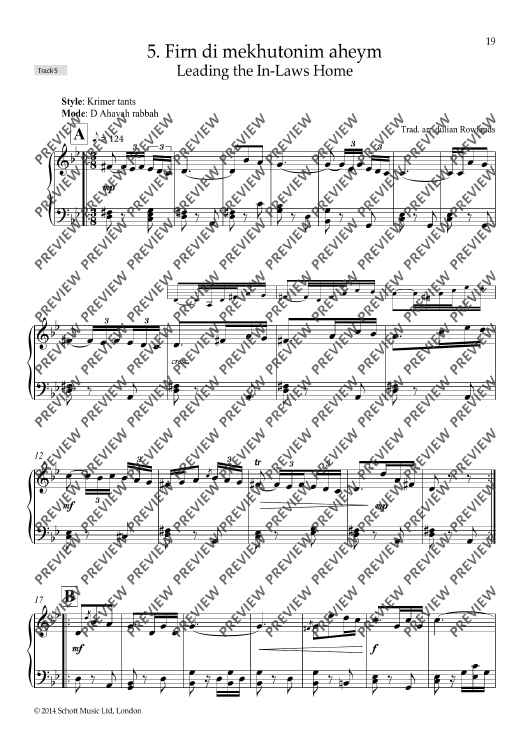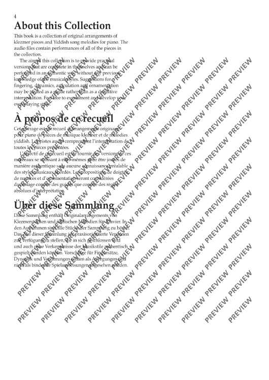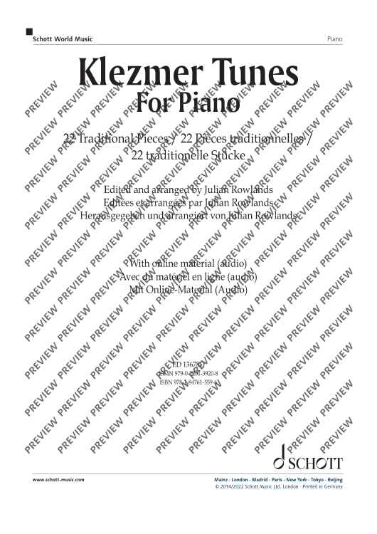 Julian Rowlands presents a wide ranging collection of Klezmer tunes and Jewish melodies for piano. Highly flexible to use, the pieces may be performed by a solo pianist. Information on the history of Klezmer music, its scales, modes and forms is provided, as well as guidance on general style and adding your own ornamentation, embellishment and improvisations. The volume is accompanied by a CD with a recording of all tunes performed by Julian Rowlands. KLEZMER PIANO COLLECTION - press reviews "This exciting music will offer endless endless hours of pleasure to young and old, listeners and pianists - audience and performers..." - EPTA PIANO JOURNAL "Julian Rowlands' experience as both perforemer and scholar shines through every word as he carefully explains rhythms, form and ornamentations. Fascinating!" - PIANO PROFESSIONAL