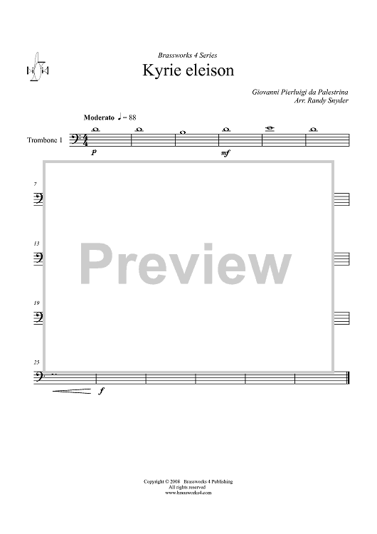 Digital Sheet Music for Kyrie eleison - Trombone 1 by Giovanni Pierluigi da Palestrina, Randy Snyder scored for Brass Quartet; id:410330