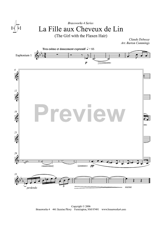 Digital Sheet Music for La Fille aux Cheveux de Lin - Euphonium 1 TC by Claude Debussy, Barton Cummings scored for Brass Quartet; id:358203