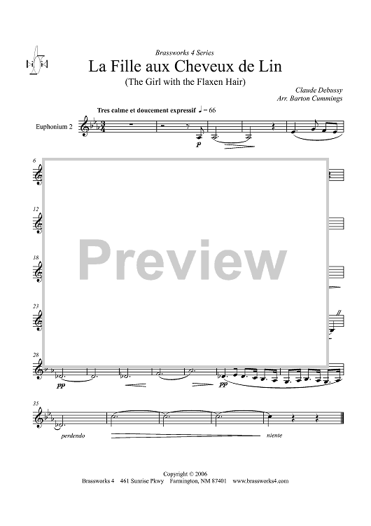 Digital Sheet Music for La Fille aux Cheveux de Lin - Euphonium 2 TC by Claude Debussy, Barton Cummings scored for Brass Quartet; id:358205