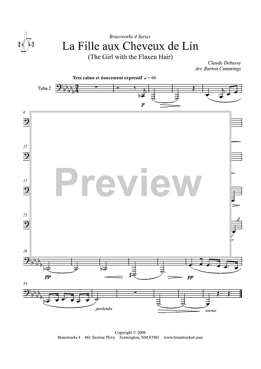 Digital Sheet Music for La Fille aux Cheveux de Lin - Tuba 2 by Claude Debussy, Barton Cummings scored for Brass Quartet; id:358207