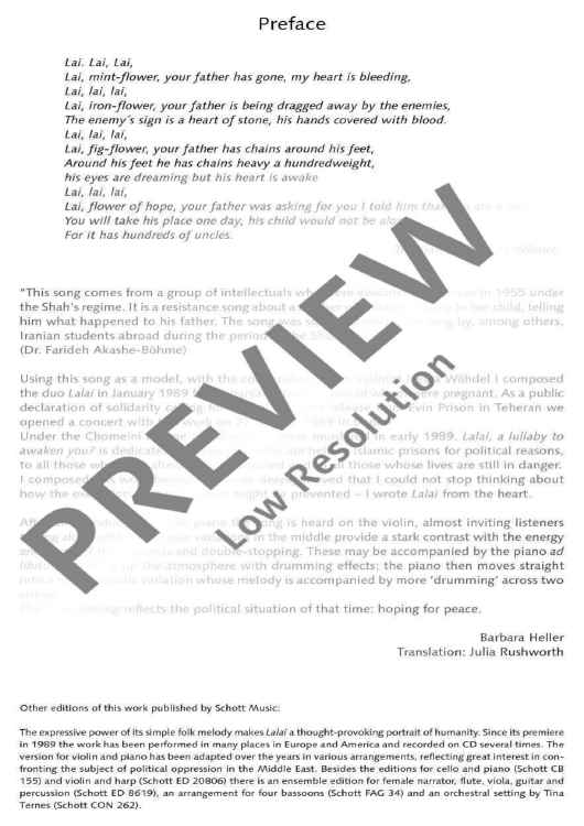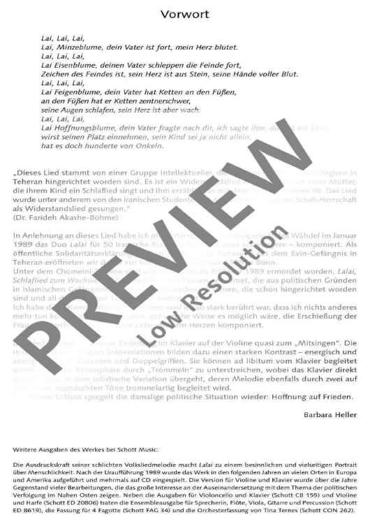 In this composition Barbara Heller uses the song Lalai created in Tehran in 1973. It is a song of resistance against the Shah regime and is about a mother who sings a lullaby to her child and tells the story of its father. Based on this song, Barbara Heller composed the duo 'Lalai, Schlaflied zum Wachwerden?' for violin (violoncello) and piano in 1989 - in memory of 50 Iranian women who were murdered under the regime of Khomeini.
