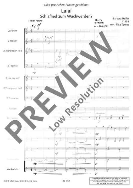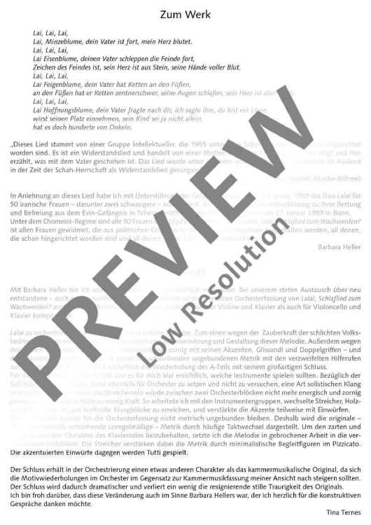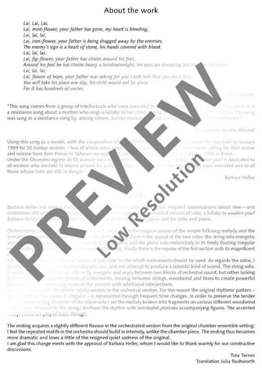 In this composition Barbara Heller uses the song Lalai created in Tehran in 1973. It is a song of resistance against the Shah regime and is about a mother who sings a lullaby to her child and tells the story of its father. Based on this song, Barbara Heller composed the duo 'Lalai, Schlaflied zum Wachwerden?' for violin (violoncello) and piano in 1989 - in memory of 50 Iranian women who were murdered under the regime of Khomeini. Lalai is now published in an orchestral version for the first time. Tina Ternes has sensitively orchestrated the charmingly simple folk tune and the desperate cries for help from Lalai with a great sense of detail. The vigorous, angry solos of the violin were instrumented for strings, woodwinds and brass and turned into powerful sound blocks which take turns with melancholy, freely floating passages. The soft melody of the piano part is played by the woodwinds, accompanied by minimalist pizzicato figures of the strings. An impressive work of emotional depth.