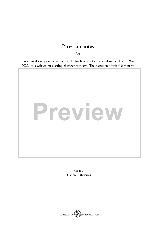 "Lea" was composed for the birth of Franco Piciotta's first granddaughter, Lea in May 2022. It is written for string chamber orchestra.