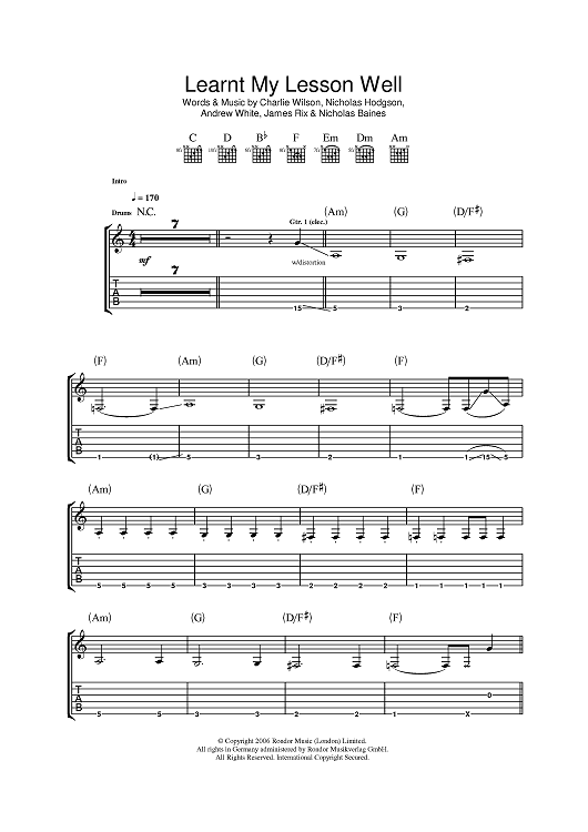 Digital Sheet Music for Learnt My Lesson Well by Nick Baines, Nick Hodgson, Kaiser Chiefs, Simon Rix, Andrew White, Charlie Wilson scored for Guitar Tab; id:397030