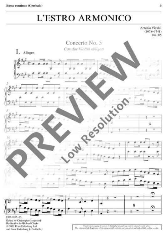 "L'Estro Armonico in A major - Basso Continuo" Sheet Music by Antonio Vivaldi
