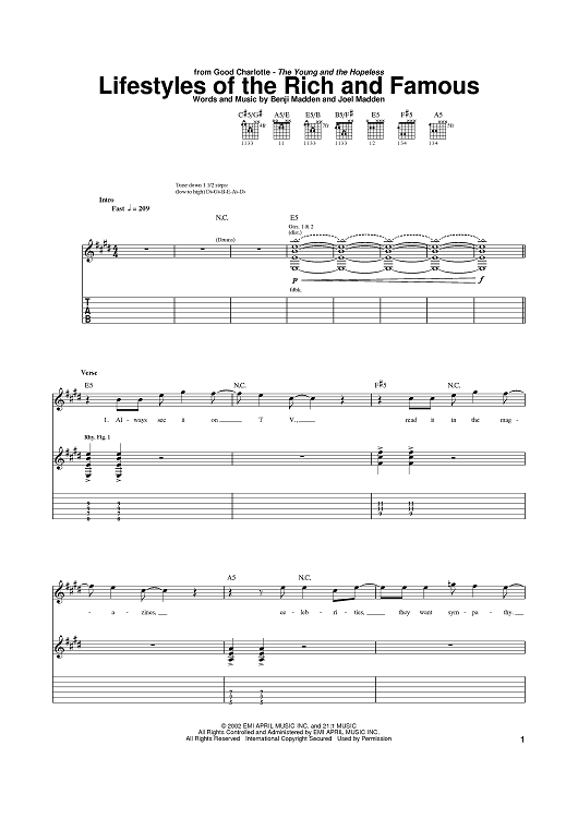 Digital Sheet Music for Lifestyles Of The Rich And Famous by Benji Madden, Joel Madden, Good Charlotte scored for Guitar Tab; id:371007