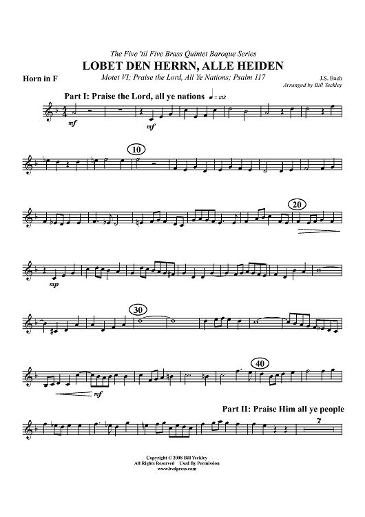 Digital Sheet Music for Lobet den Herrn, Alle Heiden - Horn in F by Bill Yeckley, Johann Sebastian Bach scored for Brass Quintet; id:428154