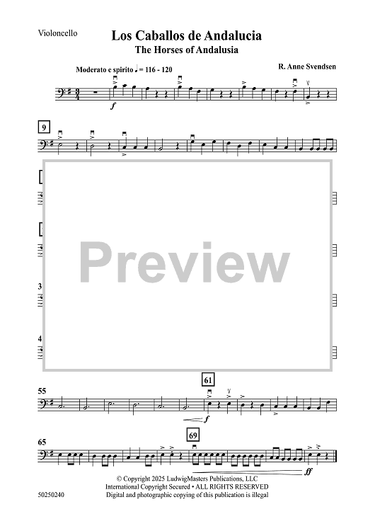 Digital Sheet Music for Los Caballos de Andalucia: The Horses of Andalusia - Violoncello by R. Anne Svendsen scored for String Orchestra; id:508664